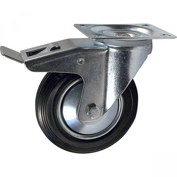 Опора промышленная поворотная с тормозом (шинка - черная литая резина, обод - оцинкованная сталь, в оси - роликовый подшипник)